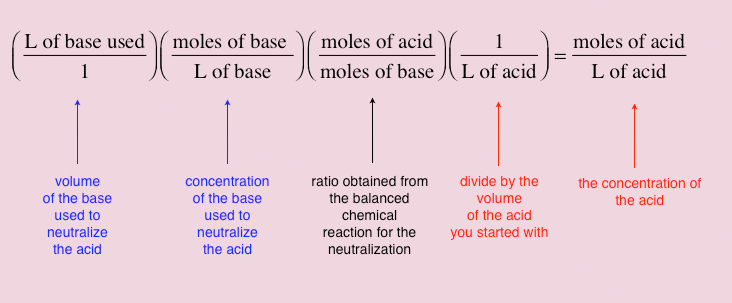 In the demonstration shown above in Figures 2 and 3, the concentration of the HCl was know. If, however, it where not known, it could be determined from the volume and concentration of the base that was used to neutralize a known volume of the acid. You can then use this information to determine the concentration of the acid you had at the start of the experiment. Such an experiment used to determine an unknown concentration is called a titration. Figure 4 below shows how the unknown concentration is determined.