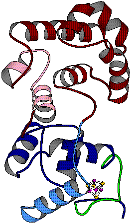 Ribbon representation of Escherichia coli enonuclease III structure. Helix-hairpin-helix (HhH) motif = pink [4Fe-4S] cluster loop (FCL) motif = light green